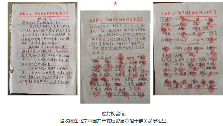 我想起了前何村民按下鲜红手印的挽留信。这封挽留信,都被大伙的手揉烂了,如今,信被放进了中国共产党历史展览馆干群关系展柜里。