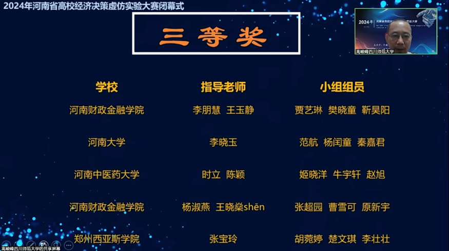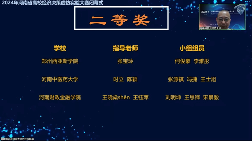 2024年度河南省高校经济决策虚仿实验大赛共有36所高校报名参赛,比赛包括初赛和决赛,分三个赛道:经济学综合博弈实验赛道,参加初赛共156支团队,晋级决赛共19所学校61支团队;财政学与公共管理决策赛道,参加初赛共53支团队,晋级决赛共7所学校22支团队;智慧银行数字化运营赛道,参加初赛共91支团队,晋级决赛共10所学校37支团队。决赛于2024年7月7日以线上形式举行。我院共有6支团队进入第二赛道决赛,其中1支队伍获得二等奖,2支队伍获得三等奖。